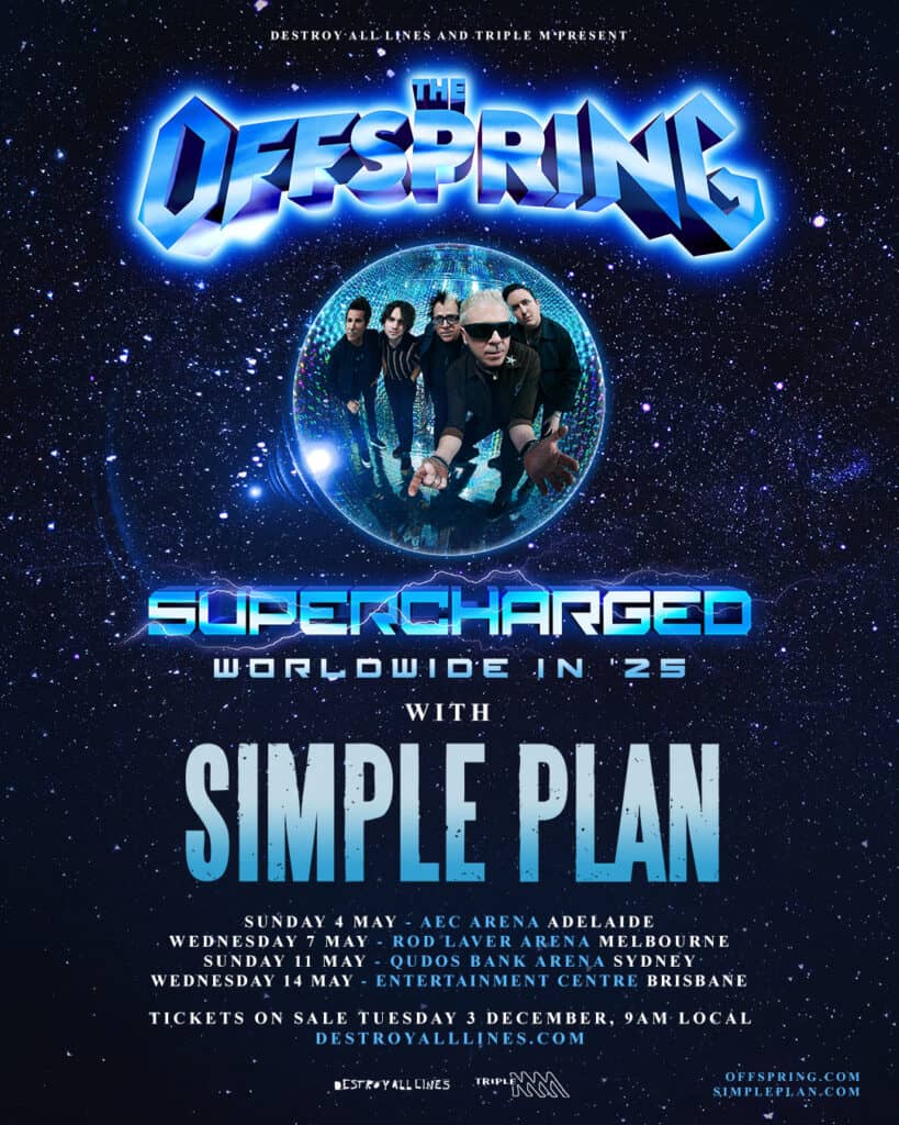 Fresh off their brand-new album Supercharged and a sold-out one-night-only performance in Melbourne, The Offspring are gearing up to supercharge their Aussie fans in May 2025. Kicking off in Adelaide, the tour will sweep through Melbourne, Sydney, and Brisbane.